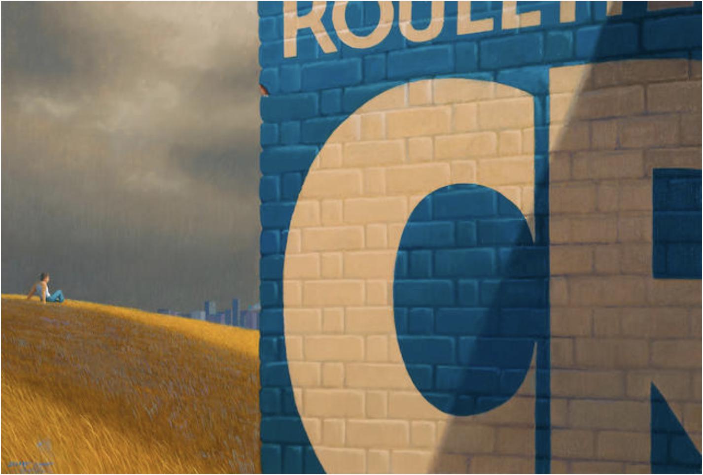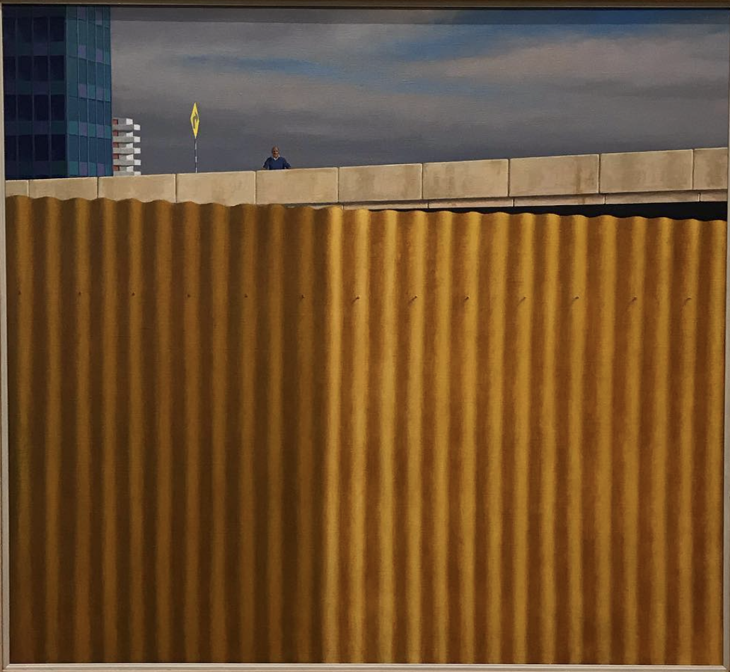The persons in Jeffrey Smart’s paintings are often small. The artist has given more weight to seemingly uninteresting objects like, for example, steps and staircases as in the Ball Game below; like corrugated iron, as in the Portrait of Clive James, and road signs and part of company logos in foreign languages, like in Richmond Park. When he wants something likeable in the foreground, he lets a seagull outshine Gustav Mahler’s wife.