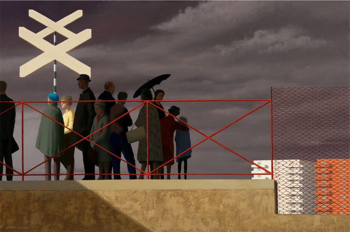 Waiting for a train is a group of people, not waiting for Godot, but waiting in the dark under an unforgivably dark sky. The young boy is an exception, and thanks for Ian who lights up the day and night, here dressed in the yellow than Jeff oridnarilly likes to put on the few woman on his plates. I leave to an arty scolar, more at home with geometry than me, to spell out the significansis it this painting. But the atmosphere is clear, though presented in both enigmatic and surrealistic sign and setting.